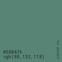Цвет #588476 в цветовой модели RGB обозначается тремя октетами (88, 132, 118) в десятичном формате и #588476 в шестнадцатиричном (hex) формате, которые являются интенсивностью красного 88 (hex 58), интенсивность зелёного 132 (hex 84) и интенсивность синего 118 (hex 76).