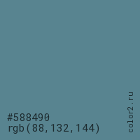 Цвет #588490 в цветовой модели RGB обозначается тремя октетами (88, 132, 144) в десятичном формате и #588490 в шестнадцатиричном (hex) формате, которые являются интенсивностью красного 88 (hex 58), интенсивность зелёного 132 (hex 84) и интенсивность синего 144 (hex 90).