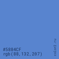 Цвет #5884CF в цветовой модели RGB обозначается тремя октетами (88, 132, 207) в десятичном формате и #5884CF в шестнадцатиричном (hex) формате, которые являются интенсивностью красного 88 (hex 58), интенсивность зелёного 132 (hex 84) и интенсивность синего 207 (hex CF).