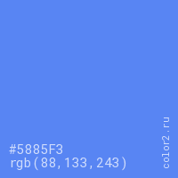 Цвет #5885F3 в цветовой модели RGB обозначается тремя октетами (88, 133, 243) в десятичном формате и #5885F3 в шестнадцатиричном (hex) формате, которые являются интенсивностью красного 88 (hex 58), интенсивность зелёного 133 (hex 85) и интенсивность синего 243 (hex F3).