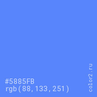 Цвет #5885FB в цветовой модели RGB обозначается тремя октетами (88, 133, 251) в десятичном формате и #5885FB в шестнадцатиричном (hex) формате, которые являются интенсивностью красного 88 (hex 58), интенсивность зелёного 133 (hex 85) и интенсивность синего 251 (hex FB).