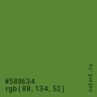 Цвет #588634 в цветовой модели RGB обозначается тремя октетами (88, 134, 52) в десятичном формате и #588634 в шестнадцатиричном (hex) формате, которые являются интенсивностью красного 88 (hex 58), интенсивность зелёного 134 (hex 86) и интенсивность синего 52 (hex 34).
