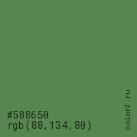 Цвет #588650 в цветовой модели RGB обозначается тремя октетами (88, 134, 80) в десятичном формате и #588650 в шестнадцатиричном (hex) формате, которые являются интенсивностью красного 88 (hex 58), интенсивность зелёного 134 (hex 86) и интенсивность синего 80 (hex 50).