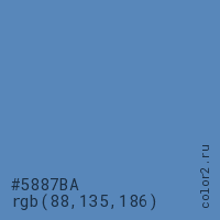 Цвет #5887BA в цветовой модели RGB обозначается тремя октетами (88, 135, 186) в десятичном формате и #5887BA в шестнадцатиричном (hex) формате, которые являются интенсивностью красного 88 (hex 58), интенсивность зелёного 135 (hex 87) и интенсивность синего 186 (hex BA).