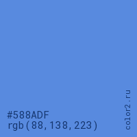 Цвет #588ADF в цветовой модели RGB обозначается тремя октетами (88, 138, 223) в десятичном формате и #588ADF в шестнадцатиричном (hex) формате, которые являются интенсивностью красного 88 (hex 58), интенсивность зелёного 138 (hex 8A) и интенсивность синего 223 (hex DF).