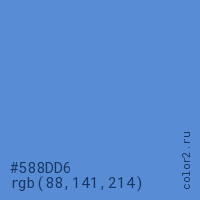 Цвет #588DD6 в цветовой модели RGB обозначается тремя октетами (88, 141, 214) в десятичном формате и #588DD6 в шестнадцатиричном (hex) формате, которые являются интенсивностью красного 88 (hex 58), интенсивность зелёного 141 (hex 8D) и интенсивность синего 214 (hex D6).