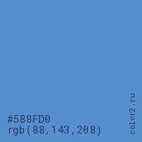 Цвет #588FD0 в цветовой модели RGB обозначается тремя октетами (88, 143, 208) в десятичном формате и #588FD0 в шестнадцатиричном (hex) формате, которые являются интенсивностью красного 88 (hex 58), интенсивность зелёного 143 (hex 8F) и интенсивность синего 208 (hex D0).