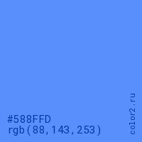Цвет #588FFD в цветовой модели RGB обозначается тремя октетами (88, 143, 253) в десятичном формате и #588FFD в шестнадцатиричном (hex) формате, которые являются интенсивностью красного 88 (hex 58), интенсивность зелёного 143 (hex 8F) и интенсивность синего 253 (hex FD).