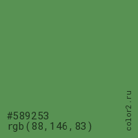 Цвет #589253 в цветовой модели RGB обозначается тремя октетами (88, 146, 83) в десятичном формате и #589253 в шестнадцатиричном (hex) формате, которые являются интенсивностью красного 88 (hex 58), интенсивность зелёного 146 (hex 92) и интенсивность синего 83 (hex 53).