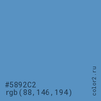 Цвет #5892C2 в цветовой модели RGB обозначается тремя октетами (88, 146, 194) в десятичном формате и #5892C2 в шестнадцатиричном (hex) формате, которые являются интенсивностью красного 88 (hex 58), интенсивность зелёного 146 (hex 92) и интенсивность синего 194 (hex C2).