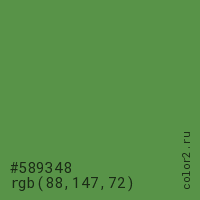 Цвет #589348 в цветовой модели RGB обозначается тремя октетами (88, 147, 72) в десятичном формате и #589348 в шестнадцатиричном (hex) формате, которые являются интенсивностью красного 88 (hex 58), интенсивность зелёного 147 (hex 93) и интенсивность синего 72 (hex 48).