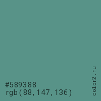 Цвет #589388 в цветовой модели RGB обозначается тремя октетами (88, 147, 136) в десятичном формате и #589388 в шестнадцатиричном (hex) формате, которые являются интенсивностью красного 88 (hex 58), интенсивность зелёного 147 (hex 93) и интенсивность синего 136 (hex 88).