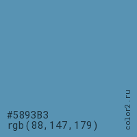 Цвет #5893B3 в цветовой модели RGB обозначается тремя октетами (88, 147, 179) в десятичном формате и #5893B3 в шестнадцатиричном (hex) формате, которые являются интенсивностью красного 88 (hex 58), интенсивность зелёного 147 (hex 93) и интенсивность синего 179 (hex B3).