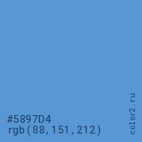 Цвет #5897D4 в цветовой модели RGB обозначается тремя октетами (88, 151, 212) в десятичном формате и #5897D4 в шестнадцатиричном (hex) формате, которые являются интенсивностью красного 88 (hex 58), интенсивность зелёного 151 (hex 97) и интенсивность синего 212 (hex D4).