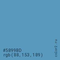 Цвет #5899BD в цветовой модели RGB обозначается тремя октетами (88, 153, 189) в десятичном формате и #5899BD в шестнадцатиричном (hex) формате, которые являются интенсивностью красного 88 (hex 58), интенсивность зелёного 153 (hex 99) и интенсивность синего 189 (hex BD).