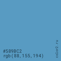 Цвет #589BC2 в цветовой модели RGB обозначается тремя октетами (88, 155, 194) в десятичном формате и #589BC2 в шестнадцатиричном (hex) формате, которые являются интенсивностью красного 88 (hex 58), интенсивность зелёного 155 (hex 9B) и интенсивность синего 194 (hex C2).