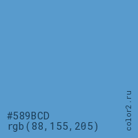 Цвет #589BCD в цветовой модели RGB обозначается тремя октетами (88, 155, 205) в десятичном формате и #589BCD в шестнадцатиричном (hex) формате, которые являются интенсивностью красного 88 (hex 58), интенсивность зелёного 155 (hex 9B) и интенсивность синего 205 (hex CD).
