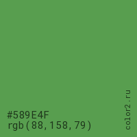Цвет RGB(88, 158, 79) в процентом отношении количества цвета состоит из 34.5% красного (red), 62% зелёного (green) и 31% синего (blue).