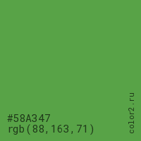 Цвет #58A347 в цветовой модели RGB обозначается тремя октетами (88, 163, 71) в десятичном формате и #58A347 в шестнадцатиричном (hex) формате, которые являются интенсивностью красного 88 (hex 58), интенсивность зелёного 163 (hex A3) и интенсивность синего 71 (hex 47).