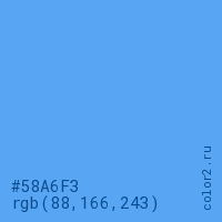 Цвет #58A6F3 в цветовой модели RGB обозначается тремя октетами (88, 166, 243) в десятичном формате и #58A6F3 в шестнадцатиричном (hex) формате, которые являются интенсивностью красного 88 (hex 58), интенсивность зелёного 166 (hex A6) и интенсивность синего 243 (hex F3).
