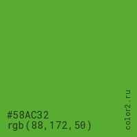 Цвет #58AC32 в цветовой модели RGB обозначается тремя октетами (88, 172, 50) в десятичном формате и #58AC32 в шестнадцатиричном (hex) формате, которые являются интенсивностью красного 88 (hex 58), интенсивность зелёного 172 (hex AC) и интенсивность синего 50 (hex 32).