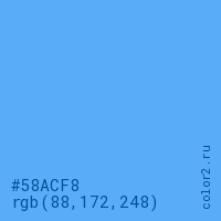 Цвет #58ACF8 в цветовой модели RGB обозначается тремя октетами (88, 172, 248) в десятичном формате и #58ACF8 в шестнадцатиричном (hex) формате, которые являются интенсивностью красного 88 (hex 58), интенсивность зелёного 172 (hex AC) и интенсивность синего 248 (hex F8).
