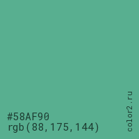Цвет #58AF90 в цветовой модели RGB обозначается тремя октетами (88, 175, 144) в десятичном формате и #58AF90 в шестнадцатиричном (hex) формате, которые являются интенсивностью красного 88 (hex 58), интенсивность зелёного 175 (hex AF) и интенсивность синего 144 (hex 90).