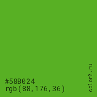 Цвет #58B024 в цветовой модели RGB обозначается тремя октетами (88, 176, 36) в десятичном формате и #58B024 в шестнадцатиричном (hex) формате, которые являются интенсивностью красного 88 (hex 58), интенсивность зелёного 176 (hex B0) и интенсивность синего 36 (hex 24).