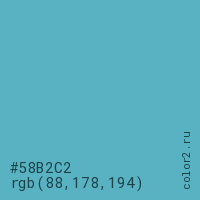 Цвет #58B2C2 в цветовой модели RGB обозначается тремя октетами (88, 178, 194) в десятичном формате и #58B2C2 в шестнадцатиричном (hex) формате, которые являются интенсивностью красного 88 (hex 58), интенсивность зелёного 178 (hex B2) и интенсивность синего 194 (hex C2).