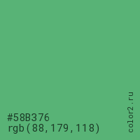Цвет #58B376 в цветовой модели RGB обозначается тремя октетами (88, 179, 118) в десятичном формате и #58B376 в шестнадцатиричном (hex) формате, которые являются интенсивностью красного 88 (hex 58), интенсивность зелёного 179 (hex B3) и интенсивность синего 118 (hex 76).