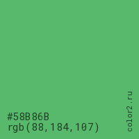 Цвет #58B86B в цветовой модели RGB обозначается тремя октетами (88, 184, 107) в десятичном формате и #58B86B в шестнадцатиричном (hex) формате, которые являются интенсивностью красного 88 (hex 58), интенсивность зелёного 184 (hex B8) и интенсивность синего 107 (hex 6B).