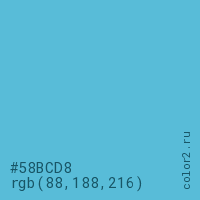 Цвет #58BCD8 в цветовой модели RGB обозначается тремя октетами (88, 188, 216) в десятичном формате и #58BCD8 в шестнадцатиричном (hex) формате, которые являются интенсивностью красного 88 (hex 58), интенсивность зелёного 188 (hex BC) и интенсивность синего 216 (hex D8).
