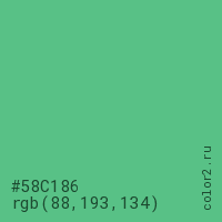 Цвет #58C186 в цветовой модели RGB обозначается тремя октетами (88, 193, 134) в десятичном формате и #58C186 в шестнадцатиричном (hex) формате, которые являются интенсивностью красного 88 (hex 58), интенсивность зелёного 193 (hex C1) и интенсивность синего 134 (hex 86).