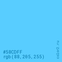 Цвет #58CDFF в цветовой модели RGB обозначается тремя октетами (88, 205, 255) в десятичном формате и #58CDFF в шестнадцатиричном (hex) формате, которые являются интенсивностью красного 88 (hex 58), интенсивность зелёного 205 (hex CD) и интенсивность синего 255 (hex FF).