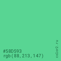Цвет #58D593 в цветовой модели RGB обозначается тремя октетами (88, 213, 147) в десятичном формате и #58D593 в шестнадцатиричном (hex) формате, которые являются интенсивностью красного 88 (hex 58), интенсивность зелёного 213 (hex D5) и интенсивность синего 147 (hex 93).