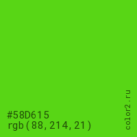 Цвет #58D615 в цветовой модели RGB обозначается тремя октетами (88, 214, 21) в десятичном формате и #58D615 в шестнадцатиричном (hex) формате, которые являются интенсивностью красного 88 (hex 58), интенсивность зелёного 214 (hex D6) и интенсивность синего 21 (hex 15).