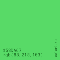 Цвет #58DA67 в цветовой модели RGB обозначается тремя октетами (88, 218, 103) в десятичном формате и #58DA67 в шестнадцатиричном (hex) формате, которые являются интенсивностью красного 88 (hex 58), интенсивность зелёного 218 (hex DA) и интенсивность синего 103 (hex 67).