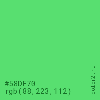 Цвет #58DF70 в цветовой модели RGB обозначается тремя октетами (88, 223, 112) в десятичном формате и #58DF70 в шестнадцатиричном (hex) формате, которые являются интенсивностью красного 88 (hex 58), интенсивность зелёного 223 (hex DF) и интенсивность синего 112 (hex 70).