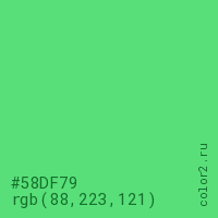 Цвет #58DF79 в цветовой модели RGB обозначается тремя октетами (88, 223, 121) в десятичном формате и #58DF79 в шестнадцатиричном (hex) формате, которые являются интенсивностью красного 88 (hex 58), интенсивность зелёного 223 (hex DF) и интенсивность синего 121 (hex 79).