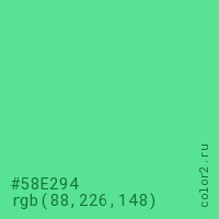 Цвет #58E294 в цветовой модели RGB обозначается тремя октетами (88, 226, 148) в десятичном формате и #58E294 в шестнадцатиричном (hex) формате, которые являются интенсивностью красного 88 (hex 58), интенсивность зелёного 226 (hex E2) и интенсивность синего 148 (hex 94).