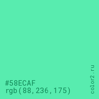 Цвет #58ECAF в цветовой модели RGB обозначается тремя октетами (88, 236, 175) в десятичном формате и #58ECAF в шестнадцатиричном (hex) формате, которые являются интенсивностью красного 88 (hex 58), интенсивность зелёного 236 (hex EC) и интенсивность синего 175 (hex AF).