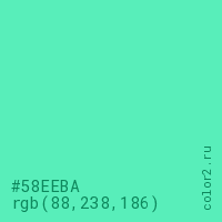 Цвет #58EEBA в цветовой модели RGB обозначается тремя октетами (88, 238, 186) в десятичном формате и #58EEBA в шестнадцатиричном (hex) формате, которые являются интенсивностью красного 88 (hex 58), интенсивность зелёного 238 (hex EE) и интенсивность синего 186 (hex BA).