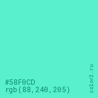 Цвет #58F0CD в цветовой модели RGB обозначается тремя октетами (88, 240, 205) в десятичном формате и #58F0CD в шестнадцатиричном (hex) формате, которые являются интенсивностью красного 88 (hex 58), интенсивность зелёного 240 (hex F0) и интенсивность синего 205 (hex CD).