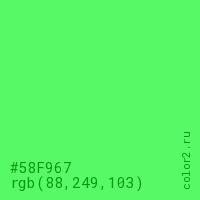 Цвет #58F967 в цветовой модели RGB обозначается тремя октетами (88, 249, 103) в десятичном формате и #58F967 в шестнадцатиричном (hex) формате, которые являются интенсивностью красного 88 (hex 58), интенсивность зелёного 249 (hex F9) и интенсивность синего 103 (hex 67).