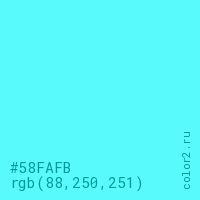 Цвет #58FAFB в цветовой модели RGB обозначается тремя октетами (88, 250, 251) в десятичном формате и #58FAFB в шестнадцатиричном (hex) формате, которые являются интенсивностью красного 88 (hex 58), интенсивность зелёного 250 (hex FA) и интенсивность синего 251 (hex FB).