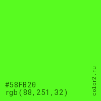 Цвет #58FB20 в цветовой модели RGB обозначается тремя октетами (88, 251, 32) в десятичном формате и #58FB20 в шестнадцатиричном (hex) формате, которые являются интенсивностью красного 88 (hex 58), интенсивность зелёного 251 (hex FB) и интенсивность синего 32 (hex 20).
