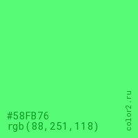 Цвет #58FB76 в цветовой модели RGB обозначается тремя октетами (88, 251, 118) в десятичном формате и #58FB76 в шестнадцатиричном (hex) формате, которые являются интенсивностью красного 88 (hex 58), интенсивность зелёного 251 (hex FB) и интенсивность синего 118 (hex 76).