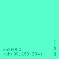 Цвет #58FDCC в цветовой модели RGB обозначается тремя октетами (88, 253, 204) в десятичном формате и #58FDCC в шестнадцатиричном (hex) формате, которые являются интенсивностью красного 88 (hex 58), интенсивность зелёного 253 (hex FD) и интенсивность синего 204 (hex CC).