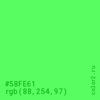 Цвет #58FE61 в цветовой модели RGB обозначается тремя октетами (88, 254, 97) в десятичном формате и #58FE61 в шестнадцатиричном (hex) формате, которые являются интенсивностью красного 88 (hex 58), интенсивность зелёного 254 (hex FE) и интенсивность синего 97 (hex 61).