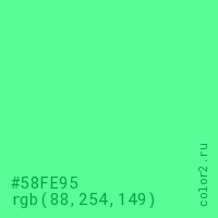 Цвет #58FE95 в цветовой модели RGB обозначается тремя октетами (88, 254, 149) в десятичном формате и #58FE95 в шестнадцатиричном (hex) формате, которые являются интенсивностью красного 88 (hex 58), интенсивность зелёного 254 (hex FE) и интенсивность синего 149 (hex 95).